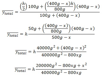 El centro de gravedad por parte de la cerveza siempre que hallamos bebido «x» g de ella, serán los gramos que quedan de ella (400 – x) multiplicados por su altura media, que vendrá dada por la masa dividida entre 400 y multiplicada por «h», y divididos de nuevo entre 2 para calcular la altura media.