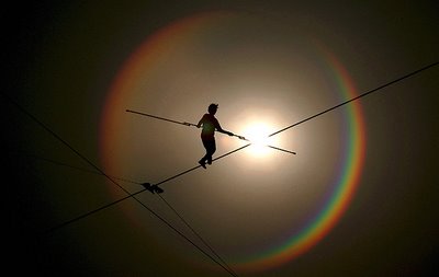 Porque baja su centro de gravedad y, si además éste queda ubicado por debajo del cable, en cuanto el funambulista se quiera caer para un lado, la acción del peso y la reacción vertical del cable le devolverán el equilibrio.