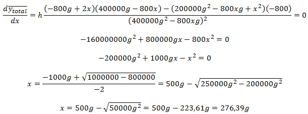 Esta sería el centro de gravedad en función del valor de «x». Si queremos conocer su mínimo debemos derivarla e igualarla a 0: