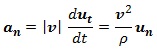 La aceleración normal o centrípeta es igual al cuadrado de la velocidad dividida entre el radio.