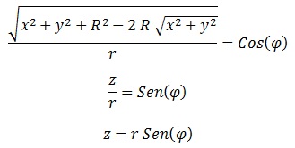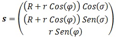 La cual, personalmente, yo calificaría de intuitiva porque es fácil llegar a ella sin hacer cuentas, teniendo en cuenta que el valor de «z», la altura, viene dado por el grosor «r» de la circunferencia base proyectado con el ángulo de elevación «φ», mientras que «x» e «y» definen una circunferencia de radio «R» más la proyección horizontal del grosor.
