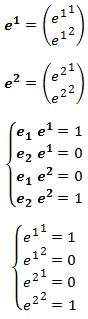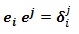 es decir, para cada elemento «i» de la base principal existe un único elemento «j» con el cual posee un producto escalar igual a la unidad, y es ortogonal a todos los demás (en base a que si el producto escalar es nulo los vectores son ortogonales). Para expresar esta expresión más cómodamente se define la delta de kronecker y se incluye en la ecuación: