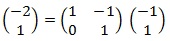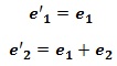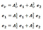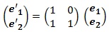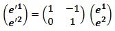 es decir, mantenemos el primer vector de la base idéntico, y hacemos que en esta ocasión el segundo vector base sea la suma de los dos anteriores. Definimos como matriz de transformación covariante a la matriz «Λ» que expresa este cambio de coordenadas: