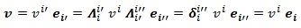 Resulta de nuevo más cómodo introducir una notación más clara para esta expresión, y para ello la expresaremos con la notación de Einstein. Podemos expresar cada elemento de la matriz según su fila «i» y su columna » i’ «, de modo que con la notación de Einstein el hecho de que dos elementos tengan la misma letra en un índice y uno de los índices esté abajo (sea covariante) y el otro esté arriba (sea contravariante)  implica que se suman todos los posibles valores del índice. Para verlo, escribiremos la transformación de nuevo y después expondremos lo que representa en nuestro caso: