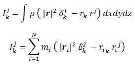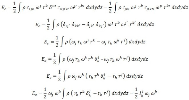 Ahora, usando el tensor de Levi-Civita para expresar los productos vectoriales en el espacio euclídeo y tenemos en cuenta que la densidad volumétrica de masa es «ρ» y depende de «r» llegamos a la expresión buscada que introduce el tensor de inercia:
