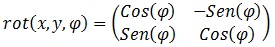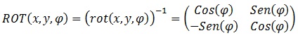En caso de haber querido girar en la otra dirección, sencillamente querría tendríamos que cambiar el signo de «φ», y tenemos la ventaja de que como el coseno es una función para le da absolutamente igual, mientras que el seno por su parte al ser impar simplemente cambia de signo: