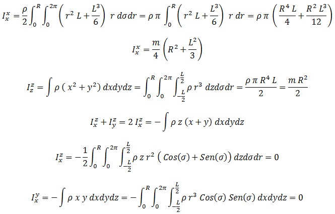 Calcularemos ahora para comprobar que el tensor funciona los momentos de inercia de una varilla respecto a su centro, de un cilindro respecto a su centro, de una esfera respecto a su centro y de la misma varilla respecto a su extremo.