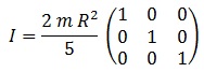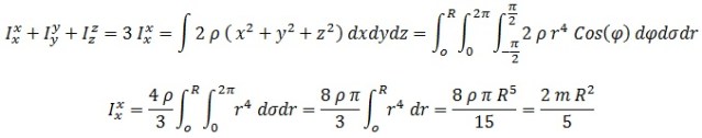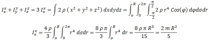 En este caso, por ser un sólido perfectamente simétrico centrado en el origen y de radio «R», las componentes «xx», «yy» y «zz» serán indénticas, del mismo modo que lo serán «xy», «xz» e «yz». Las coordenadas que usaremos serán parecidas a las esféricas, con la particularidad de que el ángulo polar «φ» irá entre [-π/2,π/2] y no entre [0,π]. Por ser todos los ejes que salen por el centro simétricos, asumimos directamente que los términos cruzados son nulos para evadir integrales complicadas: