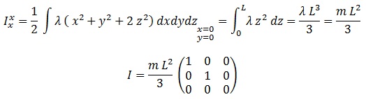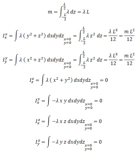 Supongamos la varilla colocada sobre el eje «z» y que tenga una longitud «L» centrada en el origen de coordenadas, de forma que haya media varilla hacia arriba y media varilla hacia abajo. Es importante tener en cuenta que al tener la varilla sólo longitud, debemos integrar sobre una línea y no sobre un volumen, además de trabajar con la densidad lineal «λ» en vez de la volumétrica. Sus ejes de simetría serán los propios ejes {x, y, z}, por lo que deberá quedar diagonal. Las componentes del tensor de inercia serán en este caso: