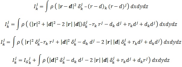 Si consideramos el tensor de inercia con respecto al centro de gravedad de un cuerpo, podemos considerar cualquier desplazamiento respecto de este siguiendo un vector «d» que deberemos restar constantemente a «r» para efectuar la traslación matemática. Esto nos lleva a: