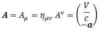, donde dividimos v entre la velocidad de la luz en el vacío c por una correspondencia de unidades, del mismo modo que en relatividad dividimos en el tensor energía-momento la energía. Si queremos este cuadrivector en su versión covariante, simplemente tenemos que considerar la métrica de Minkowski que cambia de signo las componentes de a: