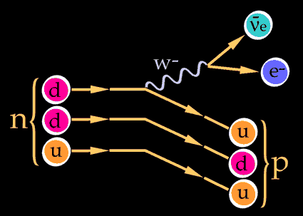 De la «ecuación» anterior, podemos despejar dos reacciones de desintegración, que son la del neutrón y la del protón: