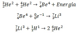 Teniendo estos dos núcleos primitivos de hidrógeno y deuterio, la creación del helio se lleva a cabo mediante la fusión nuclear, es decir, la suma de los nucleones de cada uno de ellos: