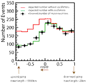 Si se asumiese que los neutrinos preservan su identidad durante su viaje el resultado experimental nos indica una gran pérdida de ellos con respecto al resultado teórico (línea roja de la gráfica). En cambio, las predicciones en base a la oscilación de neutrinos parecen estar perfectamente de acuerdo con los datos tomados (línea verde), en esta ocasión con mucha más evidencia que en el caso de los neutrinos solares.