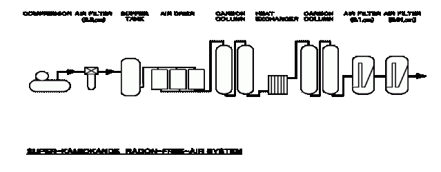 La parte superior del Súper-K  tiene forma de cúpula para dispersar todo el peso de la montaña, y tanto el techo como las paredes están sellados con polietileno con el fin de reducir la contaminación del radón en las rocas. Aún así, gran parte se cuela y es necesario filtrarlo a parte del agua a través del sistema de “liberación de aire”. El radón no sería un problema tan grave de no ser porque en la parte superior del tanque hay aproximadamente 60 cm sin agua por los que se filtra el aire con riesgo de disolver este gas radiactivo en el agua.  Ya que su desintegración  es de un millar de becquerelios por metro cúbico, es necesario un complejo sistema que pueda reducir su efecto a centésimas de becquerelio en el mismo volumen: