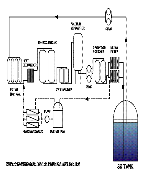 Dado que el Súper-K precisa agua de gran pureza procedente de las profundidades, es necesario eliminar de ella constantemente pequeños residuos con el fin de evitar la dispersión de la luz Cherenkov y el ruido de fondo. Así pues, el sistema de purificación de agua del Súper-K ha sido puntero en el planeta: