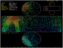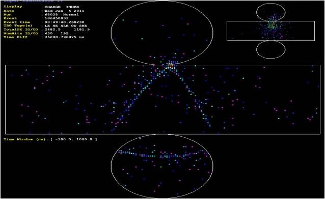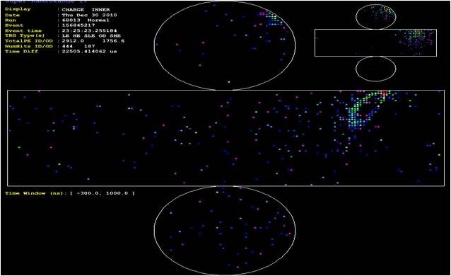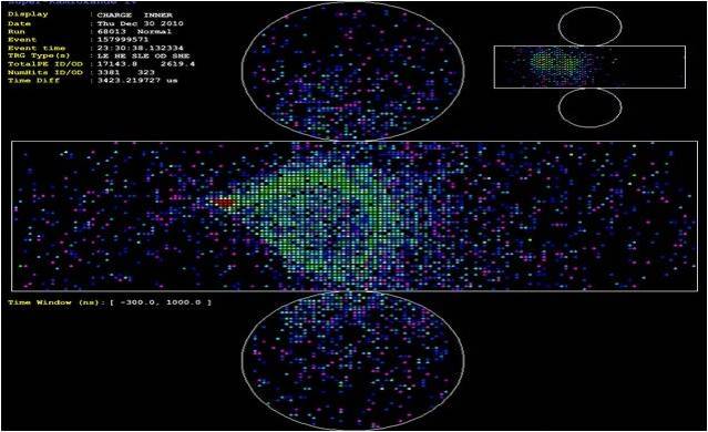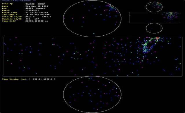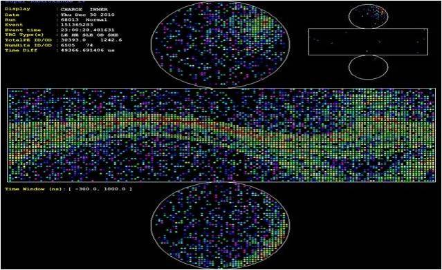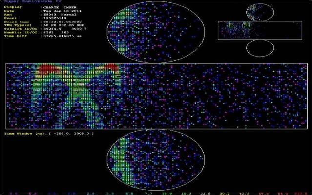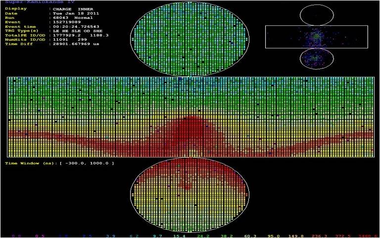 Cada poco tiempo los PMTs del Súper-K envían sus datos al equipo electrónico, que los representa en una pantalla en la que aparecen tanto el ID (cilindro grande) como el OD (cilindro pequeño). Los colores de la pantalla representan, incrementando con el espectro lumínico, el tiempo que durante el cual cada PMT ha estado recibiendo señal, con lo que los puntos rojos (más energéticos) representan partículas de gran velocidad en el centro de la señal y los puntos azules (menos energéticos) representan la frontera de los conos Cherenkov.