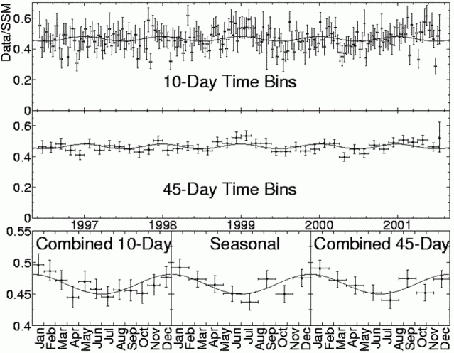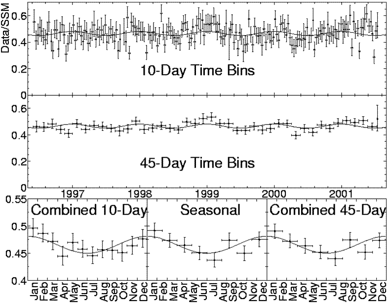 En la primera gráfica vemos que representaron el porcentaje de neutrinos frente a intervalos de 10 días, obteniendo una gráfica bastante extraña que decidieron adaptar a una curva sinusoidal muy a la fuerza, dado que bien podría ser una recta. No obstante, muchos de los puntos quedan fuera de su hipótesis sinusoidal, aún considerando las barras de error.