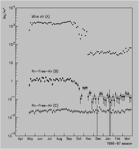 Experimentalmente, salta a la vista que el resultado es muy satisfactorio en todo momento. Apréciese también que la cantidad de radón en la mina varía con la época del año, mientras que no por ello se aprecia alguna diferencia al final del proceso: