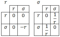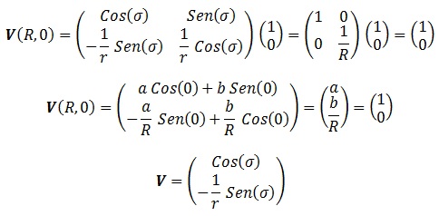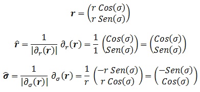 Supongamos ahora que quiero calcular las conexiones cartesiana y polar. Tengo el problema de que no sé calcular derivadas de derivadas. Por este motivo, necesito definir un sistema privilegiado en el que las derivadas de derivadas de sus parámetros valgan siempre 0, es decir, donde todas las componentes de la conexión afín se anulen. Si asumo que la conexión afín es completamente nula en cartesianas (esto implicará que mi visión geométrica de las cosas será cartesiana) puedo asumir que las derivadas entre derivadas de x e y son siempre 0, y por tanto si quiero calcular las de r y σ sólo tengo que relacionarlas con ellas. Todo esto es muy complicado de explicar con palabras, así que veámoslo con un ejemplo.