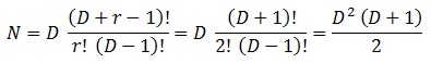 Ahora es interesante analizar su número de componentes independientes. Dado que es algo parecido a un tensor de rango 3 tendrá la dimensión D del espacio al cubo componentes que representan todas las combinaciones de valores de los índices. Pero 2 de estos índices son simétricos, lo que en virtud de lo que vimos en esta entrada implica que unas componentes dependen de otras (la ecuación recién escrita implica que si tenemos una componente tenemos su simétrica también y no hace falta calcularla). Esto nos da la ecuación para el número de componentes independientes N de la conexión afín en función de la dimensión D y el rango r de la simetría que en este caso es 2 (sería 3 si los 3 índices fuesen simétricos):