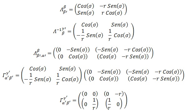 Teniendo las 4 ecuaciones de arriba es posible obtener completamente los coeficientes de la conexión. Por ejemplo, la componente σσr (siendo la primera σ el índice superior) será el número que multiplica a la derivada de σ cuando derivo de la derivada de r respecto a la de σ. La ecuación que buscamos es la segunda y vemos que el factor es 1/r, que por simetría coincide con el de la ecuación de abajo.