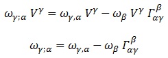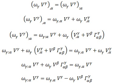 Y debido a esta invarianza escalar, podemos deducir cómo es la derivada covariante de un covector sabiendo simplemente que multiplicado escalarmente con un vector es un escalar y su producto debe ser igual derivado parcial o covariantemente: