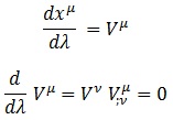 , y exigirle que su derivada sobre el parámetro de la curva sea nulo. Dicha derivada será representada por separado de lo que deriva y no es exactamente la derivada a la que estamos acostumbrados. La idea de cómo llegar hasta ella sale de la ecuación en la que surgió la derivada covariante, quitando las derivadas parciales a la derecha de cada miembro.