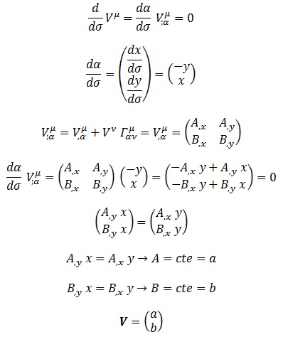 Vemos que el único campo vectorial que puede ser transportado en paralelo es el de coeficientes constantes. Esto es debido a que estamos pensando en cartesianas y además hemos escogido como base principal la de coordenadas cartesianas. Ahora, sabiendo que el vector que propusimos tenemos fijado el campo: