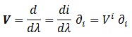 Las i representan los distintos parámetros del espacio, y estamos asumiendo notación de Einstein. Es decir, un vector es equivalente a una derivada total, y además la suma de las derivadas de los parámetros respecto a λ por la derivada parcial del parámetro. A las derivadas de cada parámetro sobre λ las denominamos componentes de V. Es importante notar que λ es el parámetro de la curva a la que queremos que sea tangente el vector, y los i son los parámetros del espacio, con lo que pueden coincidir o no.