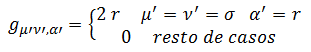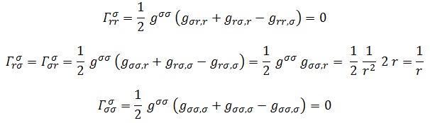 Por último, necesitamos la derivada de la métrica covariante, que será un objeto de rango 3 y, en vista de su definición, sólo existirá cuando derivemos la componente σσ respecto a r: