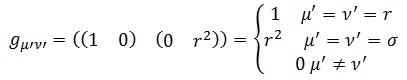 Vemos que, por cómo nos ha resultado g, la única posibilidad para que la métrica contravariante no se anule es que sus dos índices siempre sean iguales, de modo que α’ queda siempre fijado (en este caso de coordenadas polares, recalco):