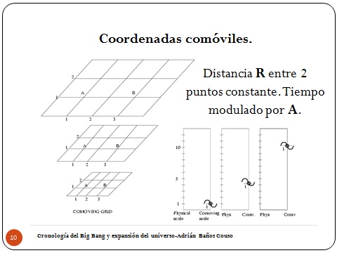 10Para trabajar con este modelo utilizamos lo que llamamos coordenadas comóviles, que básicamente lo que decimos es que la distancia entre dos puntos del universo, obviando rotaciones y tal, siempre es constante, y la llamamos R, tanto si se expande como si no.