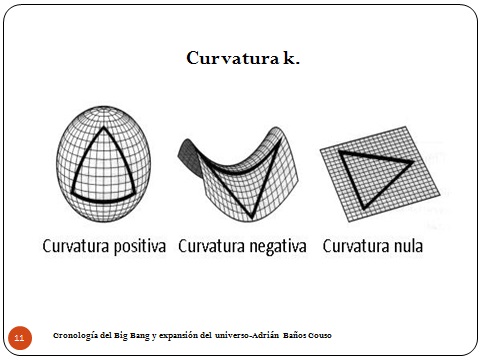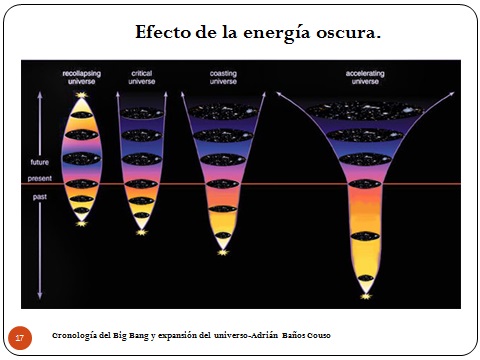 El primero sería un universo de curvatura positiva, evidentemente se comprime por lo que hemos dicho: está más concentrado. El universo de curvatura positiva es el único que tiene Big Crunch, o sea que si la curvatura no es positiva nunca nos vamos a comprimir si este modelo es cierto. Si la curvatura es nula hace eso que definimos como una curvatura parabólica. Si es negativa cada vez se abre más. Y si es con energía oscura, que es el último, sea cualquiera que sea de los otros tres, siempre hace eso de ahí. Se expande exponencialmente. O sea, que la energía oscura si aparece determina por completo lo que pasa.