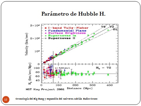 12Otra cosa importante es el parámetro de Hubble, que fijaros que no lo llamo constante de Hubble aunque es lo que habitualmente se suele decir. El parámetro de Hubble es el cociente entre la velocidad a la que se aleja de nosotros un astro y la distancia a la que está de nosotros. Esto lo miden los astrofísicos, pero lo usamos los cosmólogos. También es dominio de los astrónomos.