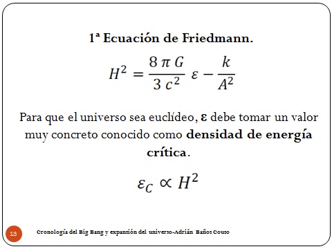 Para que el universo sea euclídeo, es decir, no tenga ni curvatura positiva ni negativa, cosa de la que no tenemos evidencia que pueda tener aunque aparezca en las ecuaciones, la densidad de energía tiene que tener un valor muy concreto conocido como densidad de energía crítica. Lo que estoy diciendo es: si yo quiero que la curvatura sea 0, llego a la relación de que la densidad de energía crítica es proporcional (Es lo que significa ese símbolo) a la constante de Hubble al cuadrado. ¿Hasta aquí todo bien? Vale. Pues esta ecuación va a ser nuestra Biblia en las siguientes diapositivas.