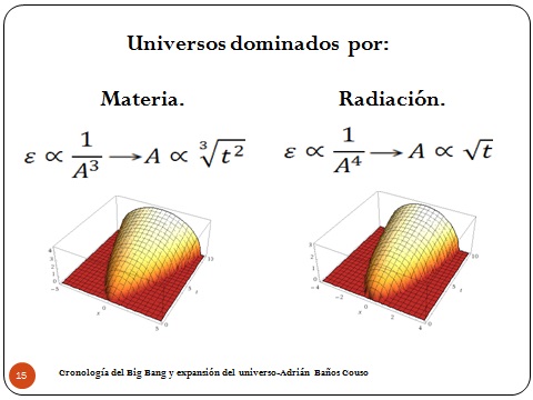 Entonces si nos guiamos por la teoría del Big Bang que nos explica un montón de cosas sin ninguna evidencia tenemos un universo dominado por radiación que al cabo de un tiempo cede a un universo dominado por materia. No tenemos energía oscura por ninguna parte. Entonces, asumiendo que qué es lo que domina en el universo puede cambiar con el tiempo vamos a ver qué nos dicen los datos que tenemos: cuánta masa, cuánta radiación, cuanta energía oscura. Para que den las ecuaciones.