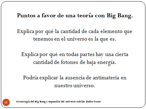 El Big Bang es importante porque explica por qué la cantidad de cada elemento en el universo es la que es y no otra. Es importante porque explica por qué en todas partes hay una cierta cantidad de fotones de baja energía (Los fotones hemos dicho que son los que se encargan de la interacción electromagnética). Y es importante porque podría explicar la ausencia de antimateria en nuestro universo. Si no tenemos Big Bang, no podemos explicar nada de eso.