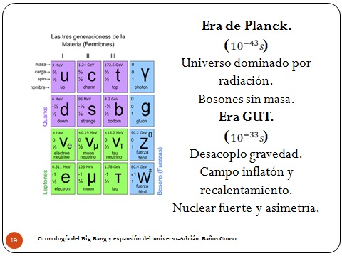 Entonces llegamos a lo que es la era GUT (GUT es Great Unification Theory, Teorías de Gran Unificación), y aquí lo que pasa es que la gravedad dice “Bueno, yo empiezo a ir por libre”. Una vez que pasa eso lo que los físicos suponen es que aparece lo que se denomina campo inflatón (Que no tiene ninguna justificación, esto es importante), y el universo empieza a expandirse. Cuando se empieza a expandir, libera energía, y esa energía se invierte en lo que denominamos recalentamiento y empieza a crear fermiones. Eso es en la era GUT. Y una vez que llegamos a esto aparecen también las interacciones fuertes, los quarks se empiezan a pegar entre ellos a través de los gluones, y una asimetría que es básicamente un apaño que metemos ahí para justificar que no haya antimateria. Esto lo que quiere decir es que pudiendo crearse tantos quarks como antiquarks elegimos pensar que estadísticamente ganaron los quarks por pura casualidad. No hay ninguna justificación. Igual que en todo lo anterior, eh, o sea que…