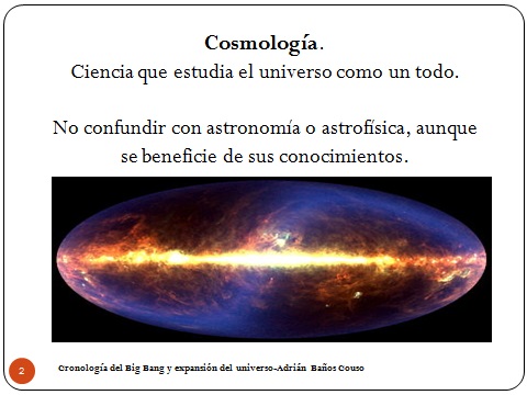 2Vamos a empezar definiendo qué es la cosmología, que es lo que tiene más problemática. La cosmología es la ciencia que estudia el universo como un todo, es decir que no es ni la astrofísica ni la astronomía. La astrofísica analiza los cuerpos que puede haber en el espacio y sus propiedades independientemente de que existan o no. La astronomía se encarga de los cuerpos que de hecho existen, dice qué periodos tienen, alrededor de dónde se mueven, la vida que llevan… Y la cosmología es considerar todo lo que hay en el universo y ver cómo funciona en conjunto. O sea, que nos da igual el planeta Tierra, nos da igual las estrellas que haya a 50 años luz, o todo eso. Sólo nos ocupamos de todo el conjunto.
