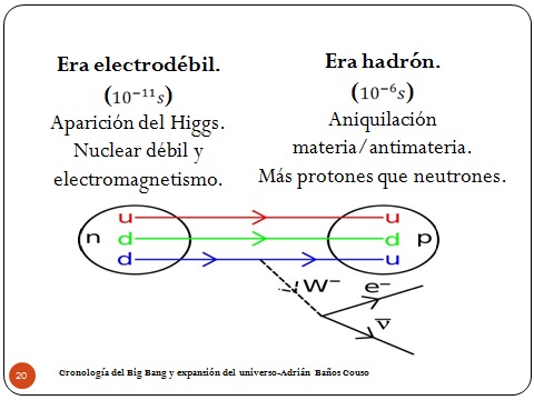 20A partir de aquí, llegamos a la Era Electrodébil, que es bastante después en escalas de Big Bang, y aquí aparece el Higgs. Entonces las partículas empiezan a tener masa. No vamos a explicar aquí lo que es el Higgs, me vais a perdonar, pero bueno, en realidad es eso, da masa a todas las partículas. En el momento en el que empieza a aparece el Higgs, las interacciones débiles y el electromagnetismo se separan, esto quiere decir que dejan de actuar de la misma forma, y aparece la reacción que tenemos debajo que es muy importante.