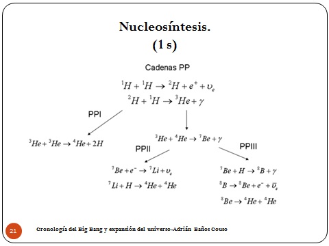 21Una vez que ya tenemos más protones que neutrones y todas las otras partículas ya están, prácticamente, llegamos a lo que se conoce como Nucleosíntesis, que es justo un segundo después del Big Bang.