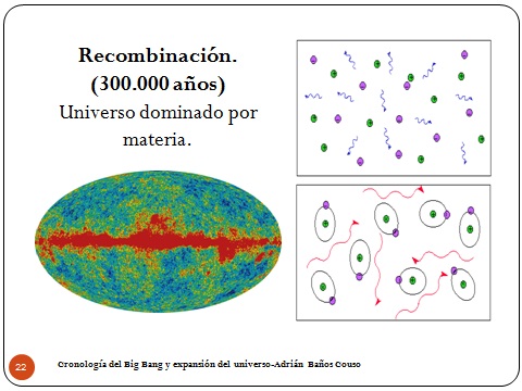 22La última etapa ya es la Recombinación. Tarda 300.000 años y es cuando empezamos a tener materia neutra de carga. El esquema de allí es muy explicativo: vemos los electrones y los núcleos. Los núcleos serían los verdes y los electrones los rosas o lilas. Y los fotones pues las ondas que van por ahí moviéndose. Llegados a este tiempo la temperatura del universo ha decaído tanto que los fotones tienen muy poca energía y no son capaces de darle a los electrones la energía suficiente para escaparse de los átomos. ¿Entonces qué pasa? Que como han perdido toda su energía, los electrones ya caen al átomo y no hay fotón posible que los pueda liberar de ahí. Entonces empezamos a tener átomos completos con carga neutra y los fotones quedan sueltos.