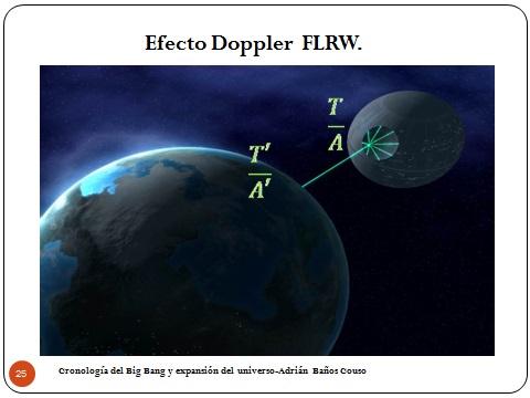 Supongamos que un planeta, o una estación espacial asesina, emite un rayo de luz hacia otro observador, otra parte del universo. La luz que emite va a tener un periodo característico T, que va a estar normalizado por el parámetro del universo A, pero cuando llegue al otro planeta A habrá cambiado a A’ porque cambia con el tiempo. Entonces, como el periodo de la luz va a tener que ser el mismo T se va a haber dilatado igual que A’. Esto es aparentemente contradictorio. El periodo es el mismo «que si el tiempo no se hubiese comprimido», lo que a efectos prácticos implica que el periodo que medimos se dilata. Esto es lo conocemos como efecto Doppler relativista, que no tiene nada que ver con el otro. Bueno, la idea es la misma. Cambian los periodos. De hecho tiene todo que ver. Lo que tenía en mente es que no es la misma ecuación, pero sigue siendo un problema de cuerpos que se mueven entre ellos.