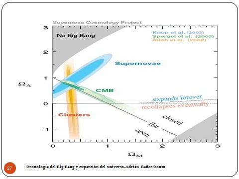 27Y con todos estos datos, la conclusión a que llegamos es esta gráfica que aquí, que es lo más importante de la ponencia. Está sin unidades, los teóricos somos así. El eje horizontal indica la densidad de energía debida a la masa y el eje vertical indica la densidad de energía debida a la energía oscura, a la constante cosmológica. La radiación la despreciamos porque tenemos evidencias de que ya no va a haber prácticamente nada. Bueno, de hecho aquí están las evidencias.
