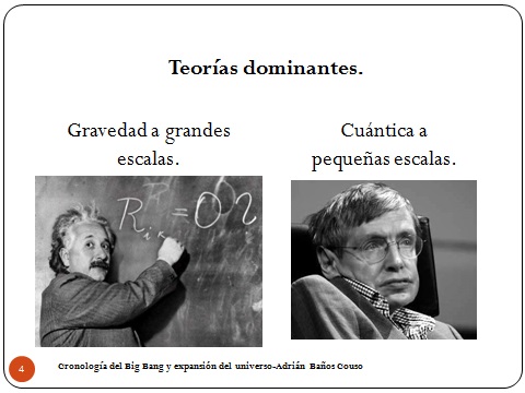 4Vistos los ingredientes vamos a ver qué teorías tenemos que usar cuando hacemos cosmología. Si estamos considerando distancias muy grandes la fuerza que domina es la gravedad, y en distancias más pequeñas domina la física cuántica, que básicamente son el electromagnetismo, la interacción débil y la interacción fuerte. Pongo las imágenes básicamente de los más importantes representantes de cada campo para la cosmología. Stephen Hawking no es cuántico, pero dentro de la cosmología es el único que ha trabajado en detalle la parte cuántica. El único conocido. Bueno, a Einstein ya supongo que lo conocéis todos.