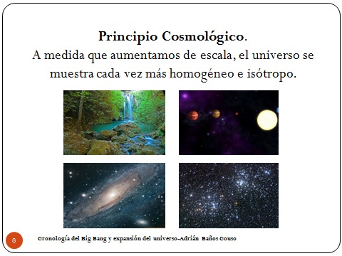 8Para estudiar cosmología lo primero que asumimos (Esto es una hipótesis de Einstein del 1916), es el principio cosmológico, que básicamente nos dice que a medida que aumentamos de escala el universo se muestra cada vez más homogéneo e isótropo. Esto quiere decir que tanto si yo me muevo como si yo me giro veo lo mismo en un sitio como en el otro.
