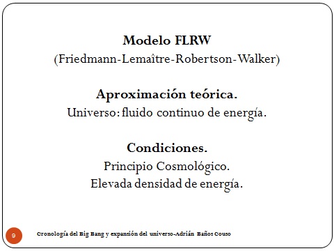 9El modelo que vamos a ver es Friedmann-Lemaître-Robertson-Walker, que son los que trabajaron sobre las ecuaciones de Einstein a partir de esa hipótesis, y la aproximación que hacen es que el universo es un fluido continuo de energía. Esto quiere decir que aunque tengamos galaxias, planetas y cosas por ahí moviéndose por el medio vamos a pensar que todo está junto y que estamos a una escala tan grande que no vemos la diferencia entre sus componentes, igual que cuando vemos agua no vemos sus moléculas.