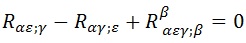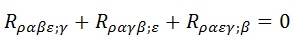 Esta ecuación es conocida como la identidad de Bianchi, que al ser igual a 0 es cierta en cualquier sistema de coordenadas. Si ahora contraemos los índices ρ y β teniendo en cuenta la definición del tensor de Ricci: