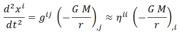 En el caso de Newton, por otra parte, sabemos que las componentes espaciales de la aceleración proceden del opuesto del gradiente de un potencial escalar. Como estamos dando por hecho que la ecuación de Newton representa un campo gravitatorio débil, no debería curvar mucho el espacio, con lo que aproximaremos la métrica que la rige por la libre de Minkowski η: